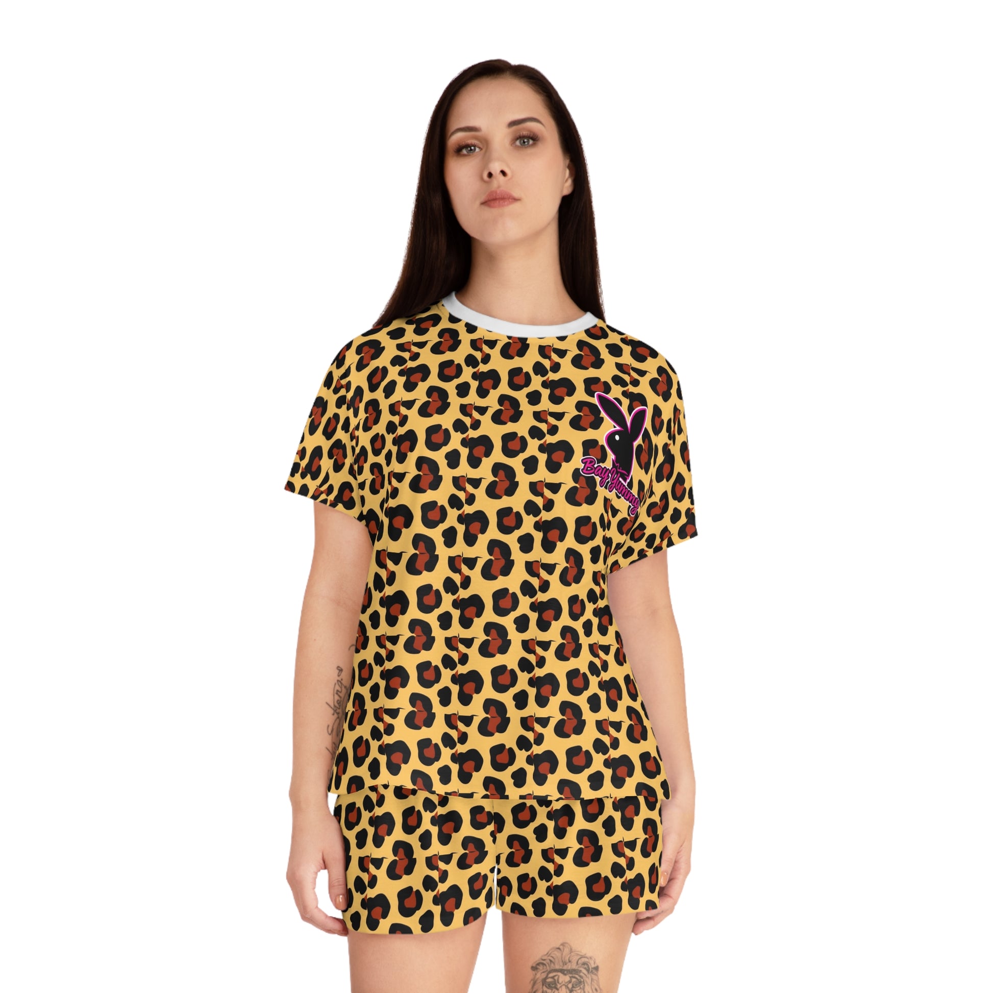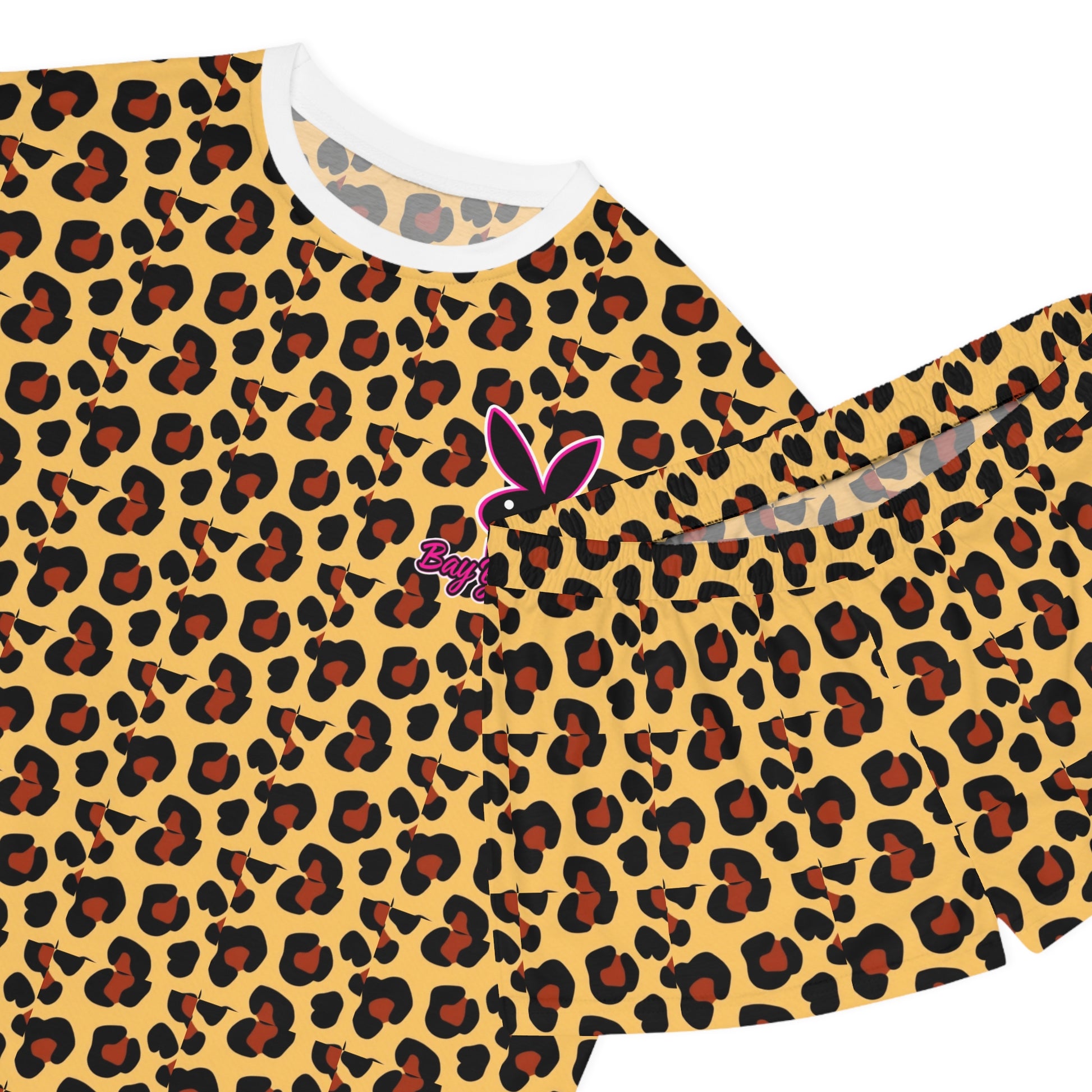 Slide into a cozy, confidently bold night with this relaxed pajama set. The soft, stretchy fabric skims the skin, while the oversized cut and no-sleeve-seam construction give it a laid-back, lived-in feel. Warm caramel and deep-black leopard spots wrap the whole set, and a crisp contrasting collar adds a clean frame at the neckline. Wear it for slow mornings with coffee, late-night chats with friends, or low-key self-care evenings when you want comfort that still reads fierce and fun.