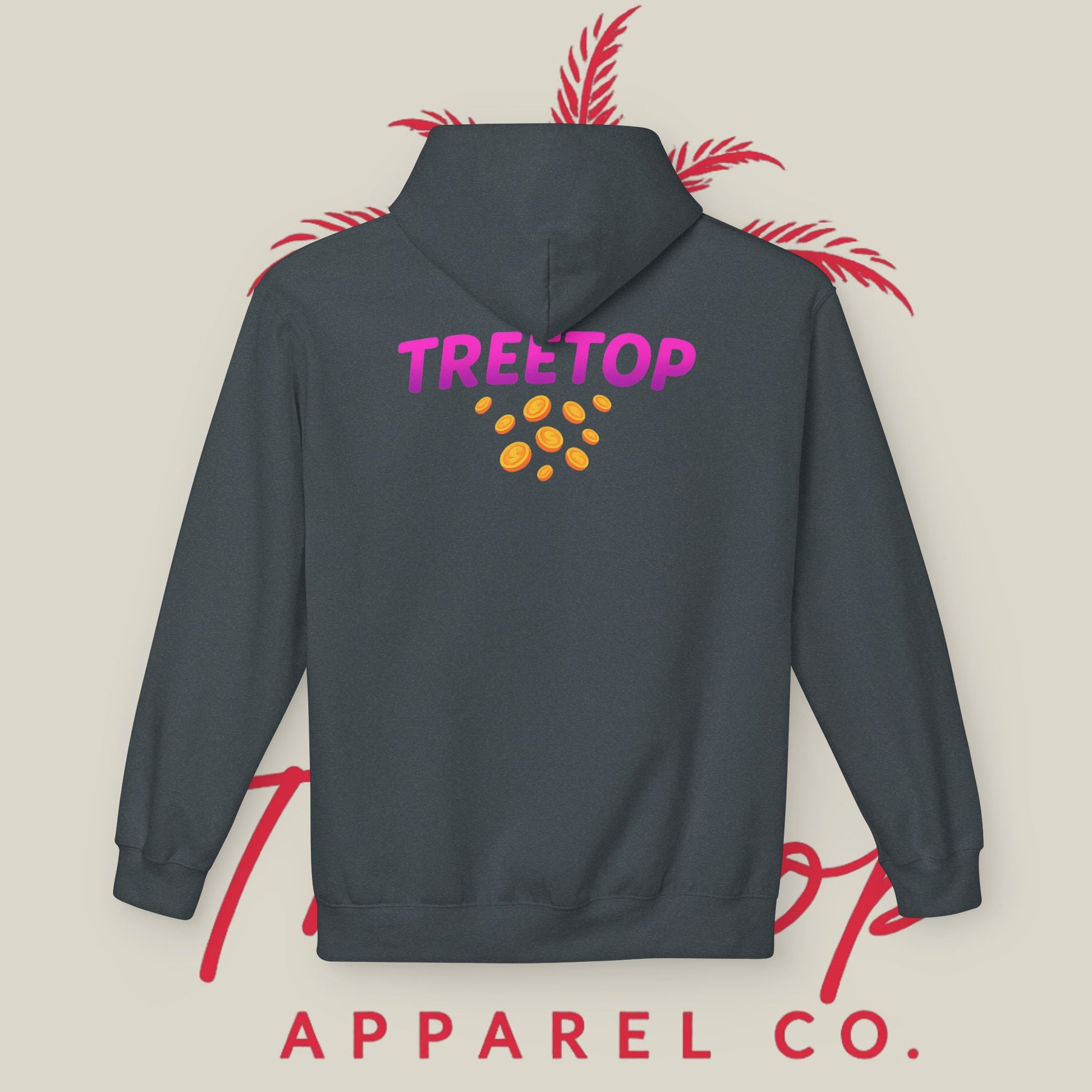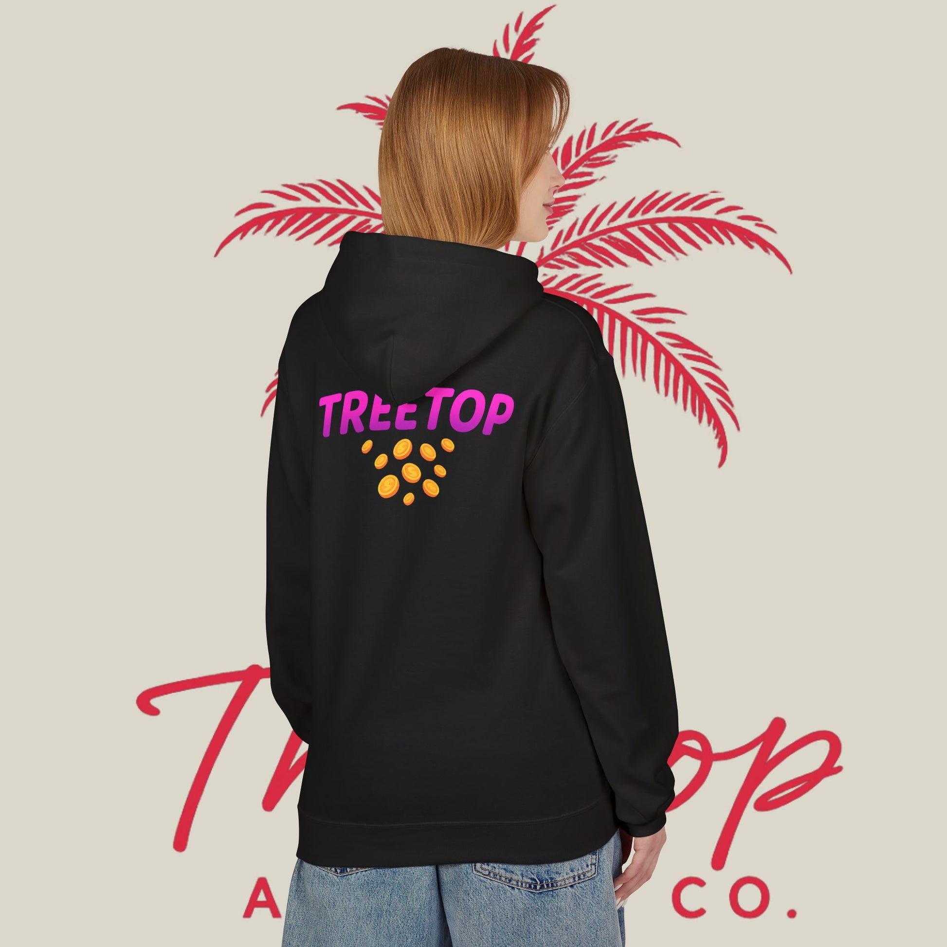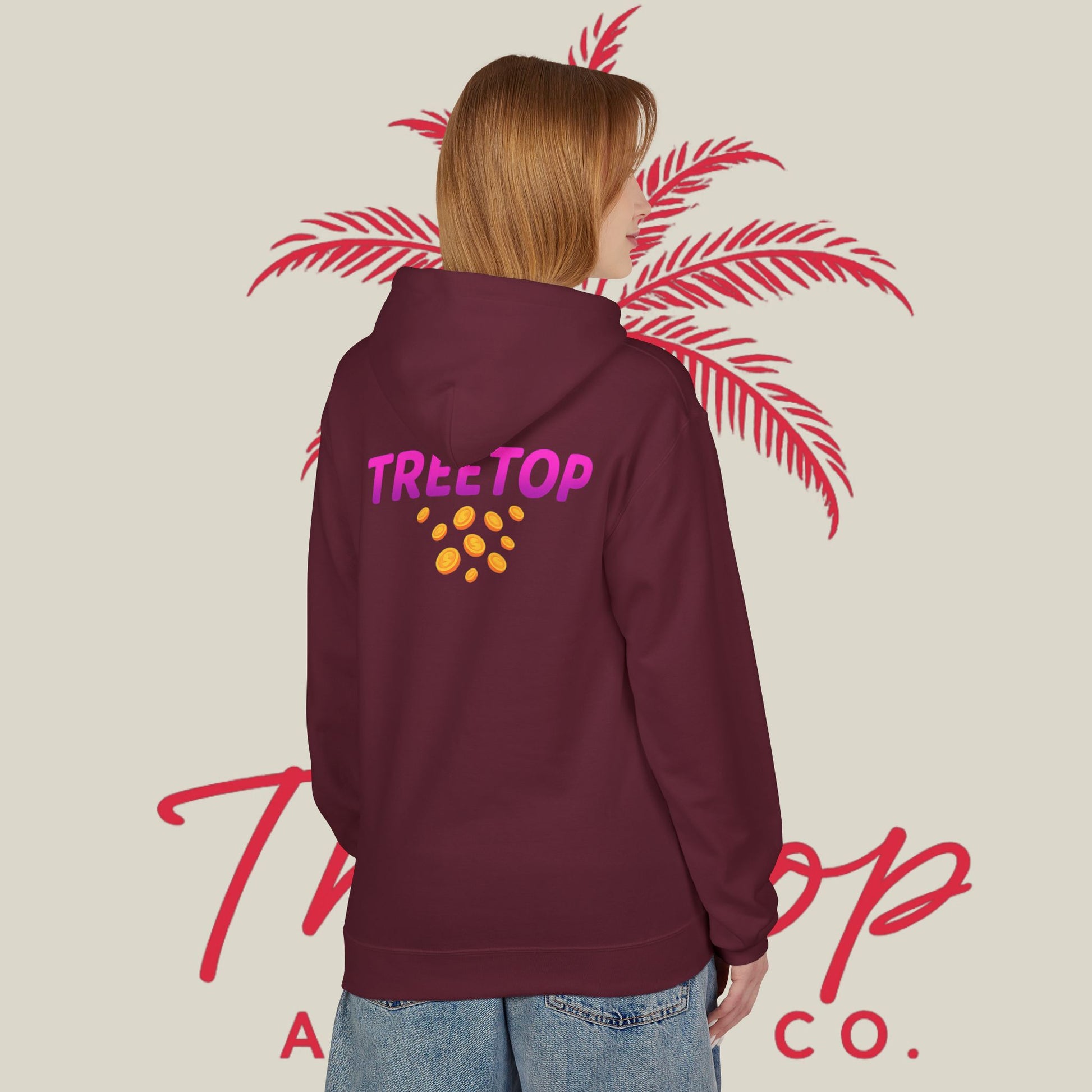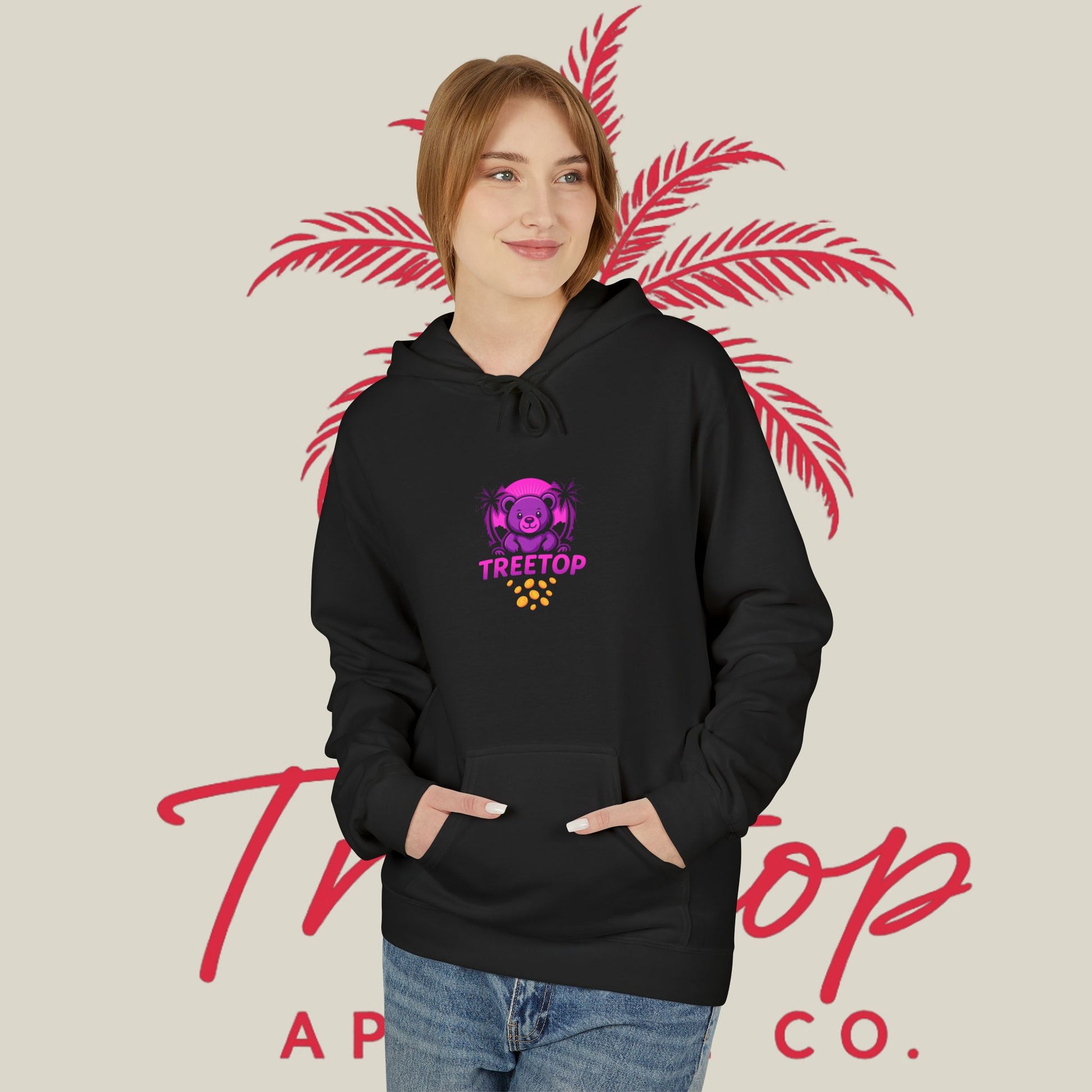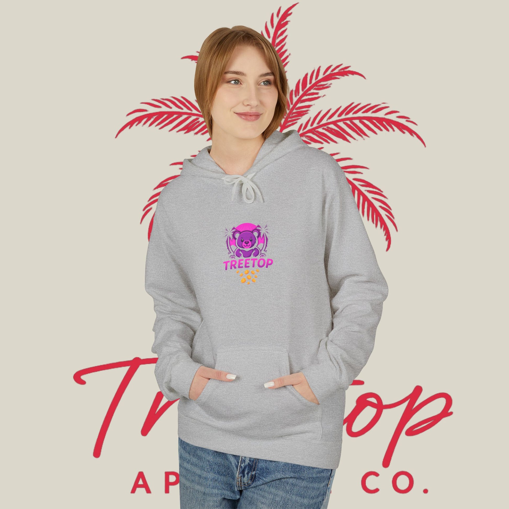 Stay cozy and stylish with this TreeTop Fit Hoodie featuring a pink logo. Perfect for lounging at home or running errands, this hoodie offers a relaxed fit and added warmth with its 2-piece hood and pouch pocket. Made with sustainable and socially conscious practices, this hoodie is a must-have for anyone looking for comfort with a touch of eco-friendliness.